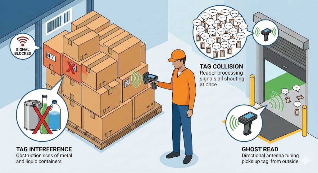 One of the most common technical issues in RFID-based warehouses is signal interference. RFID systems, especially UHF RFID, use radio waves to communicate between tags and readers. Warehouses often contain metal racks, steel containers, machinery, and liquid-based products. Metal reflects radio waves, while liquids absorb them. This creates signal attenuation and multipath interference, which can result in missed reads or inconsistent scanning.